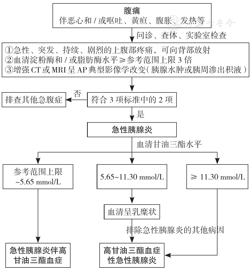 首先符合胰腺炎的诊断标准;其次血清TG水平≥1000mg/dl(11.30mmol/L),或血清TG水平为500~1000mg/dl(5.65~11.30mmol/L)但血清呈乳糜状;再次排除AP的其他病因[2]。