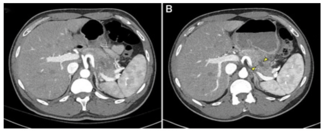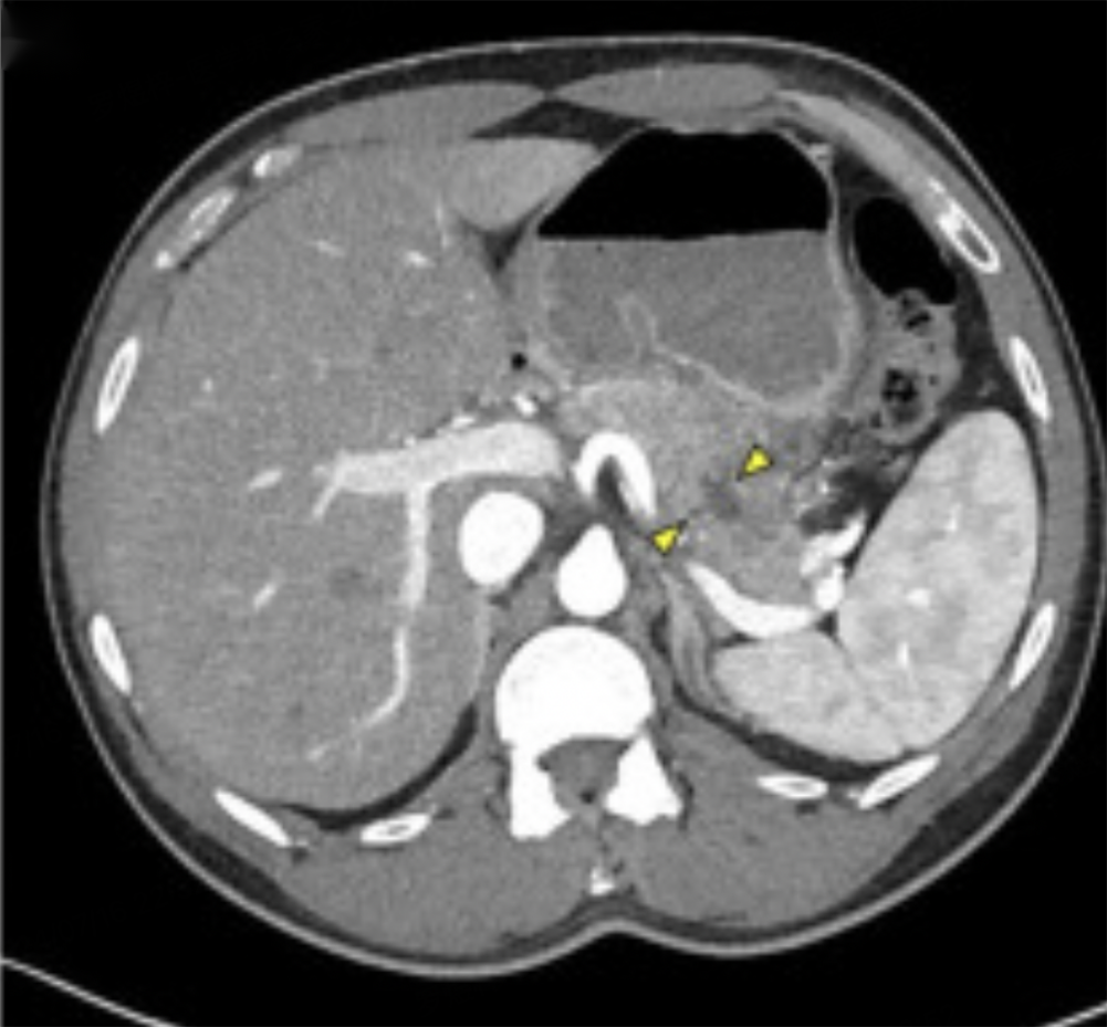 腹部/骨盆计算机断层扫描(CT)示:患者曾行胆囊切除术,胆管正常,胰腺尾部出现条索影和水肿(图1)。结合患者最近的MRCP,这些影像学发现与急性加重的慢性胰腺炎一致。